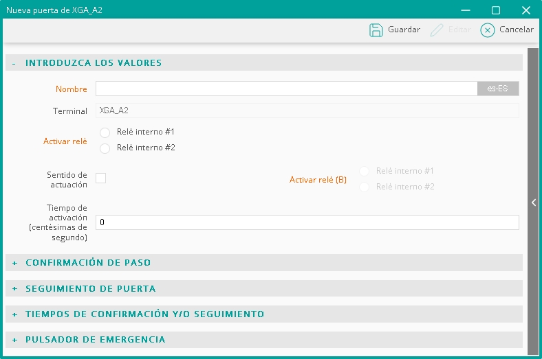 Un Terminal XGA no dispone de pantalla pero dispone de dos relés y cuatro entradas. Sólo usaremos uno de los relés para abrir la puerta pero configuraremos todos los elementos disponibles: