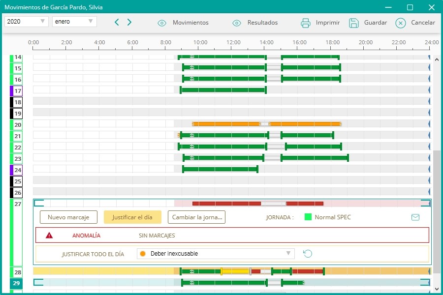 Al acceder a esta opción se obtendrá una pantalla con los marcajes del mes en curso. Cuando hay una anomalía, está indicada con una franja roja.